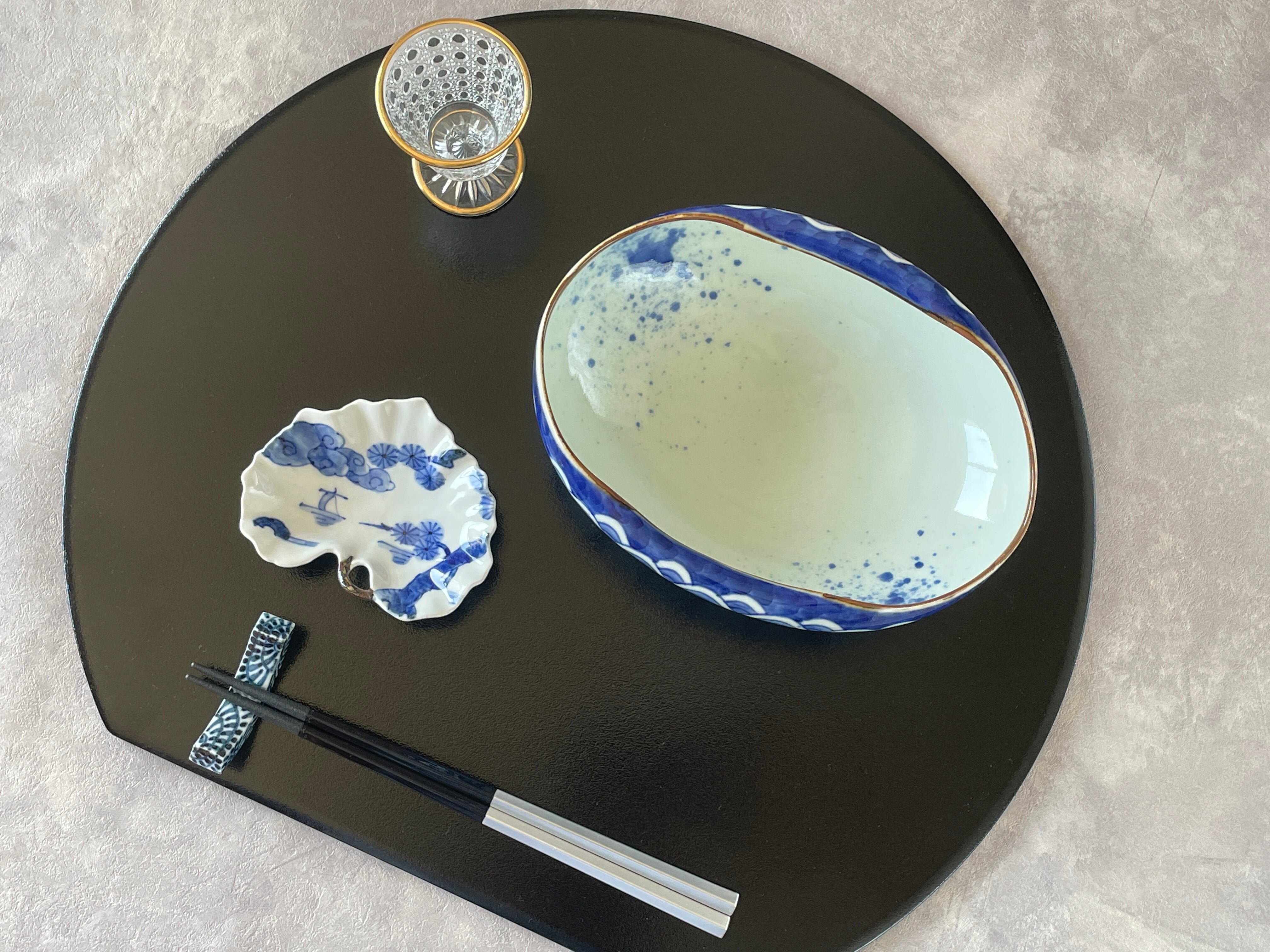 有田焼 染付渕青海十草波地紋楕円捻り鉢