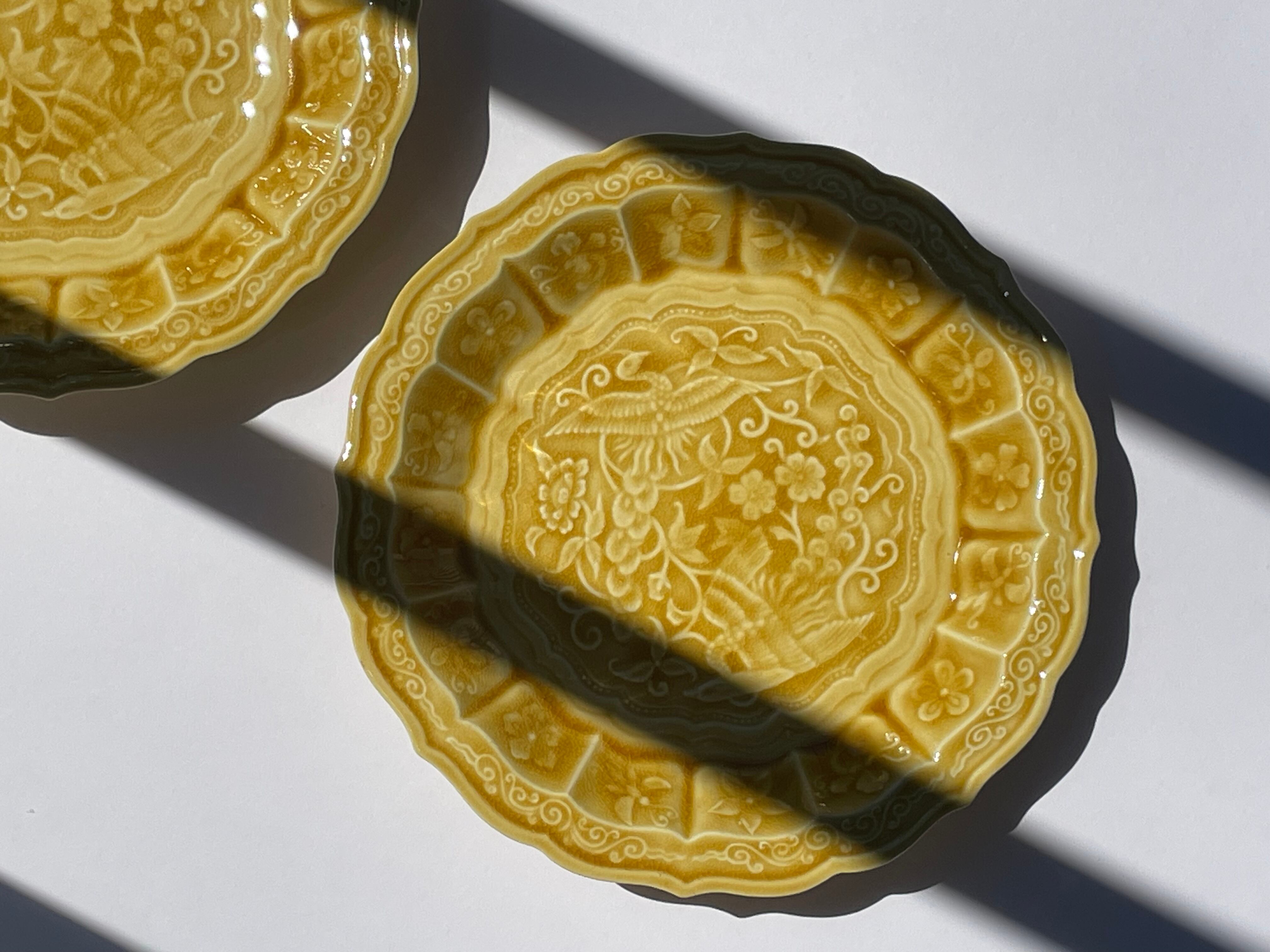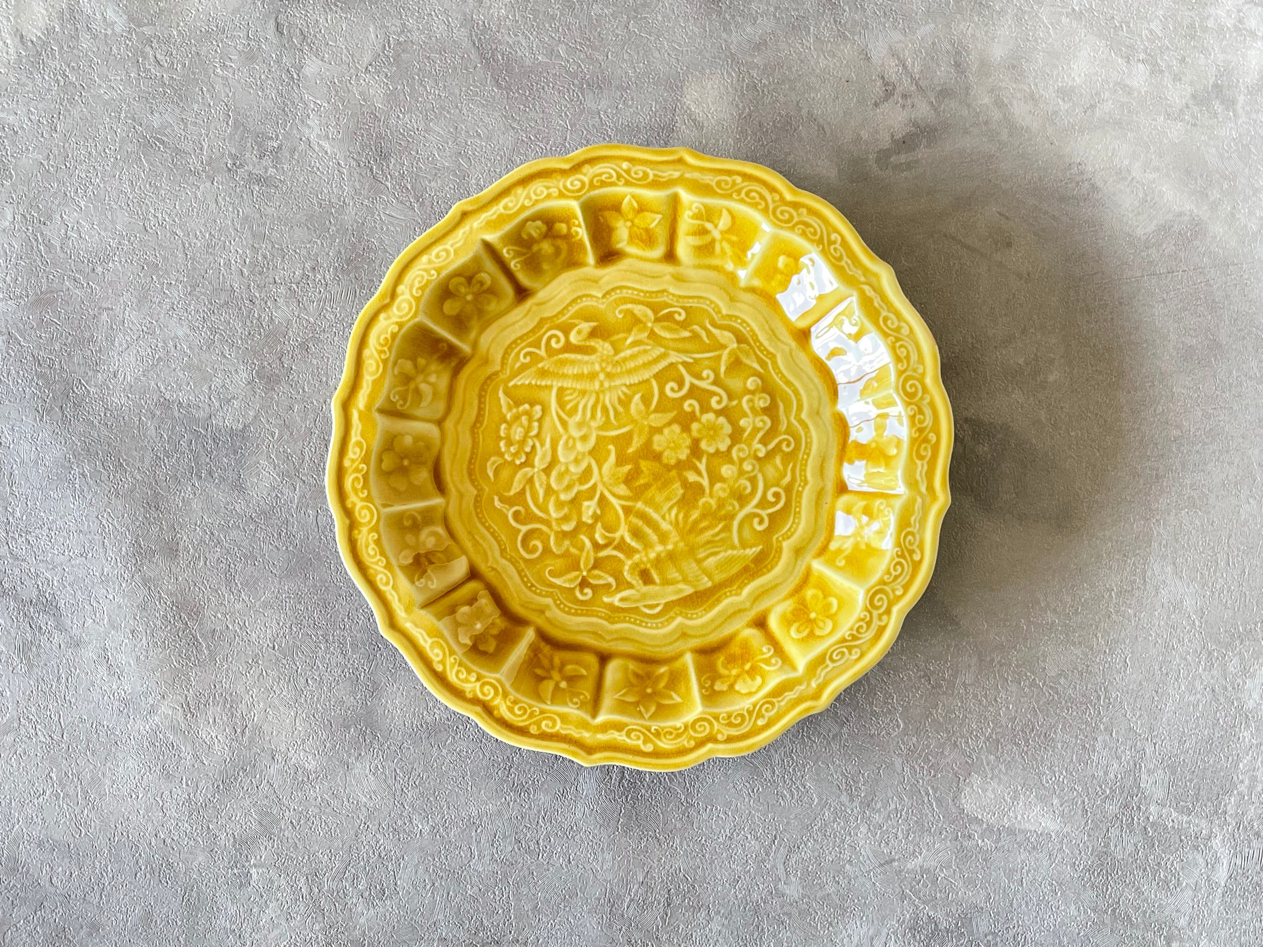 有田焼 間取り花蝶 / 鳳凰彫り5寸皿 取り皿 (黄交趾)