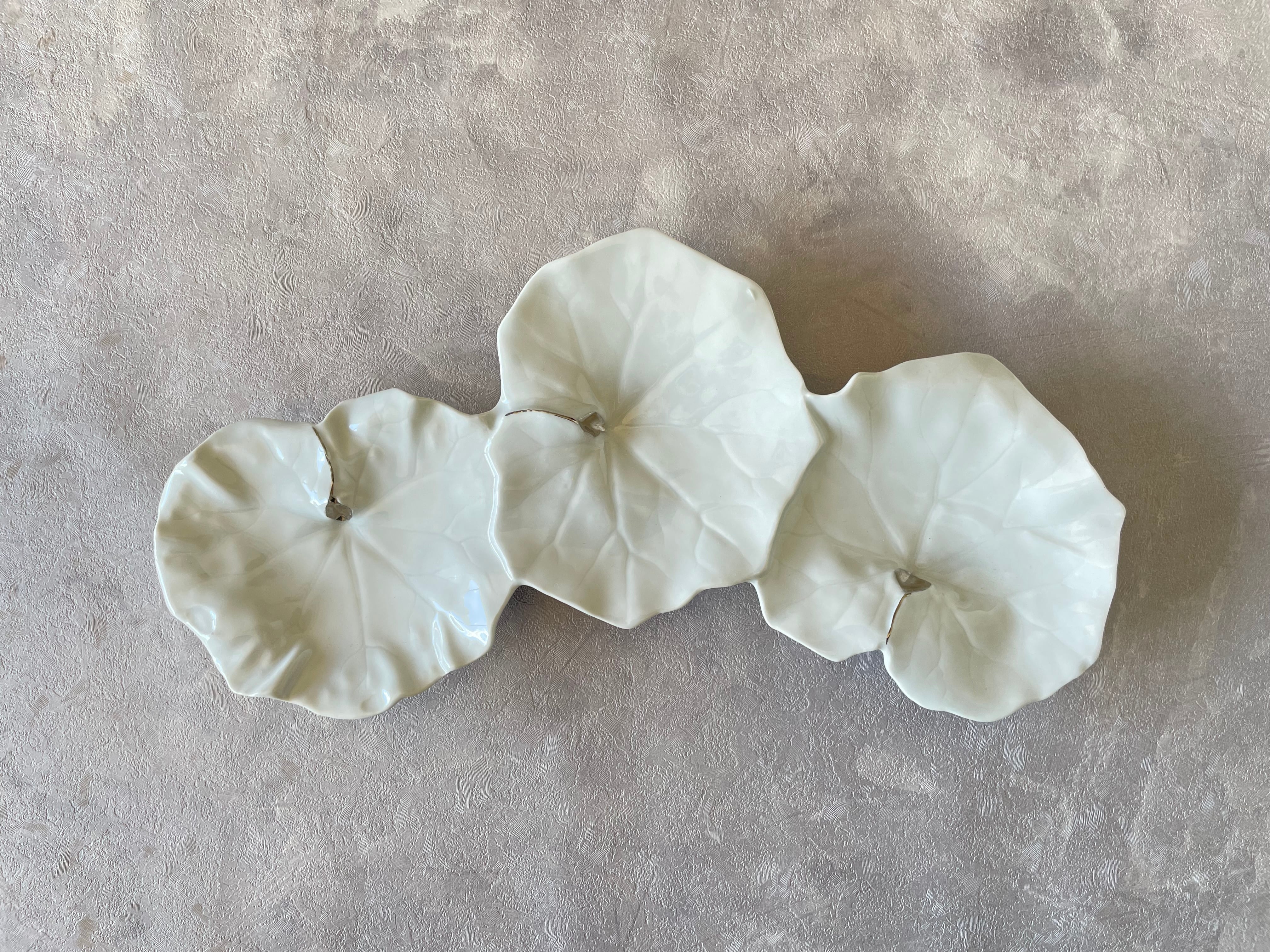 有田焼 福泉窯 白磁釉プラチナ茎 つわの葉三連皿