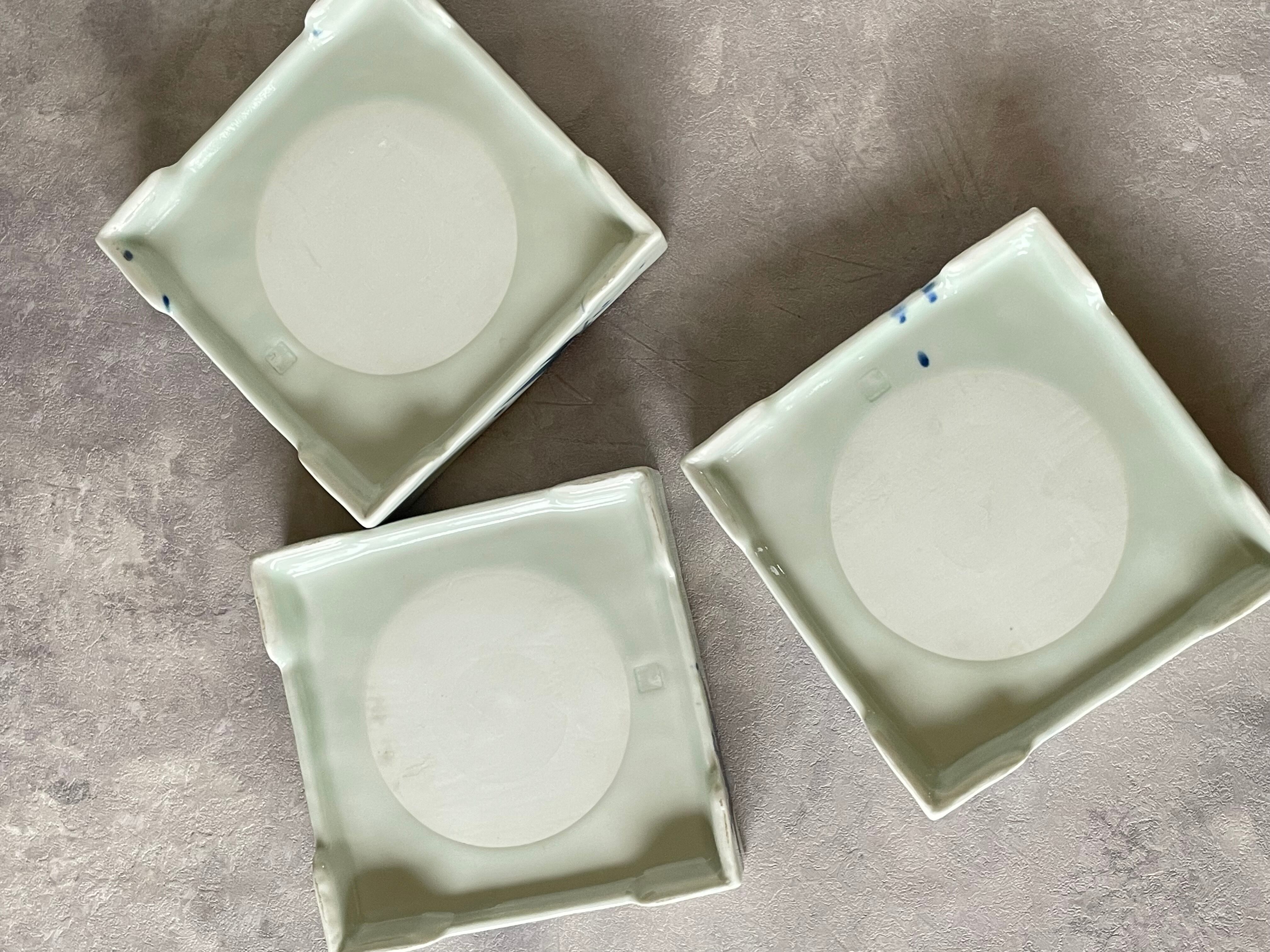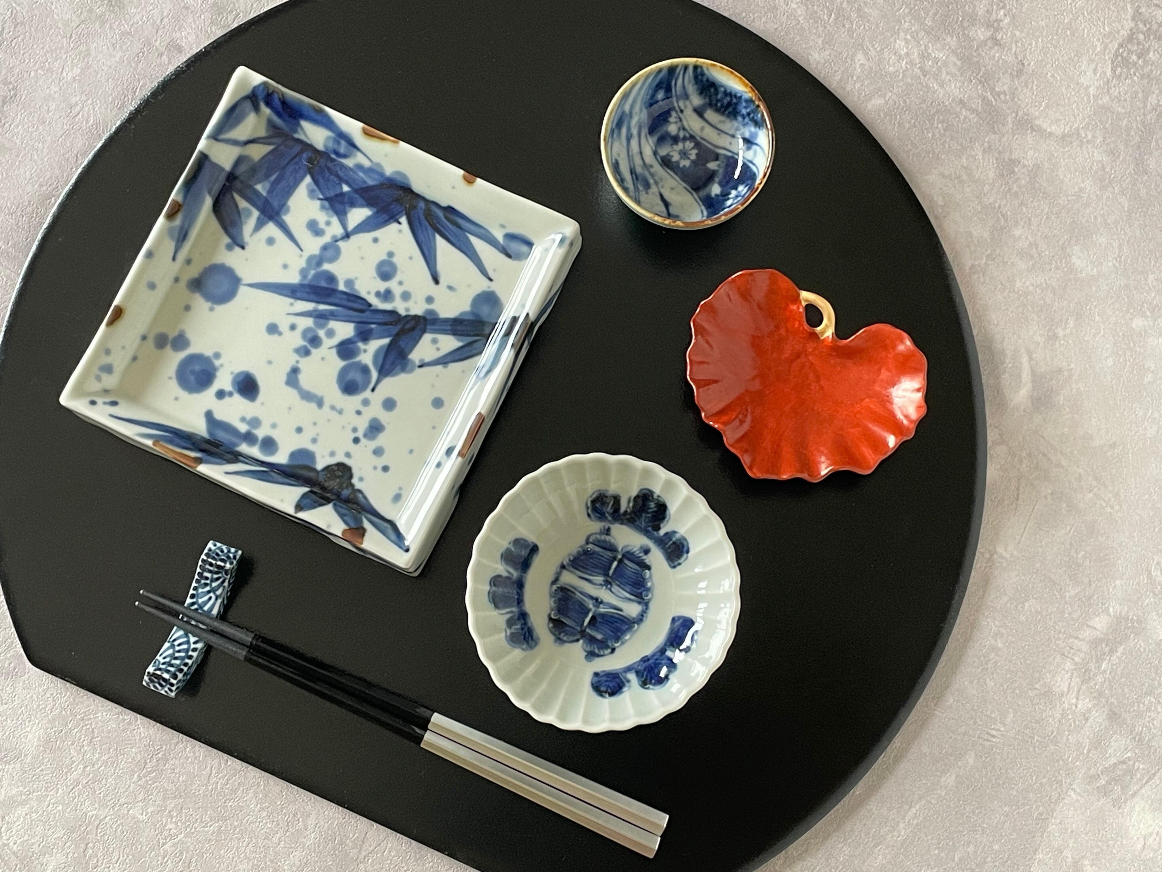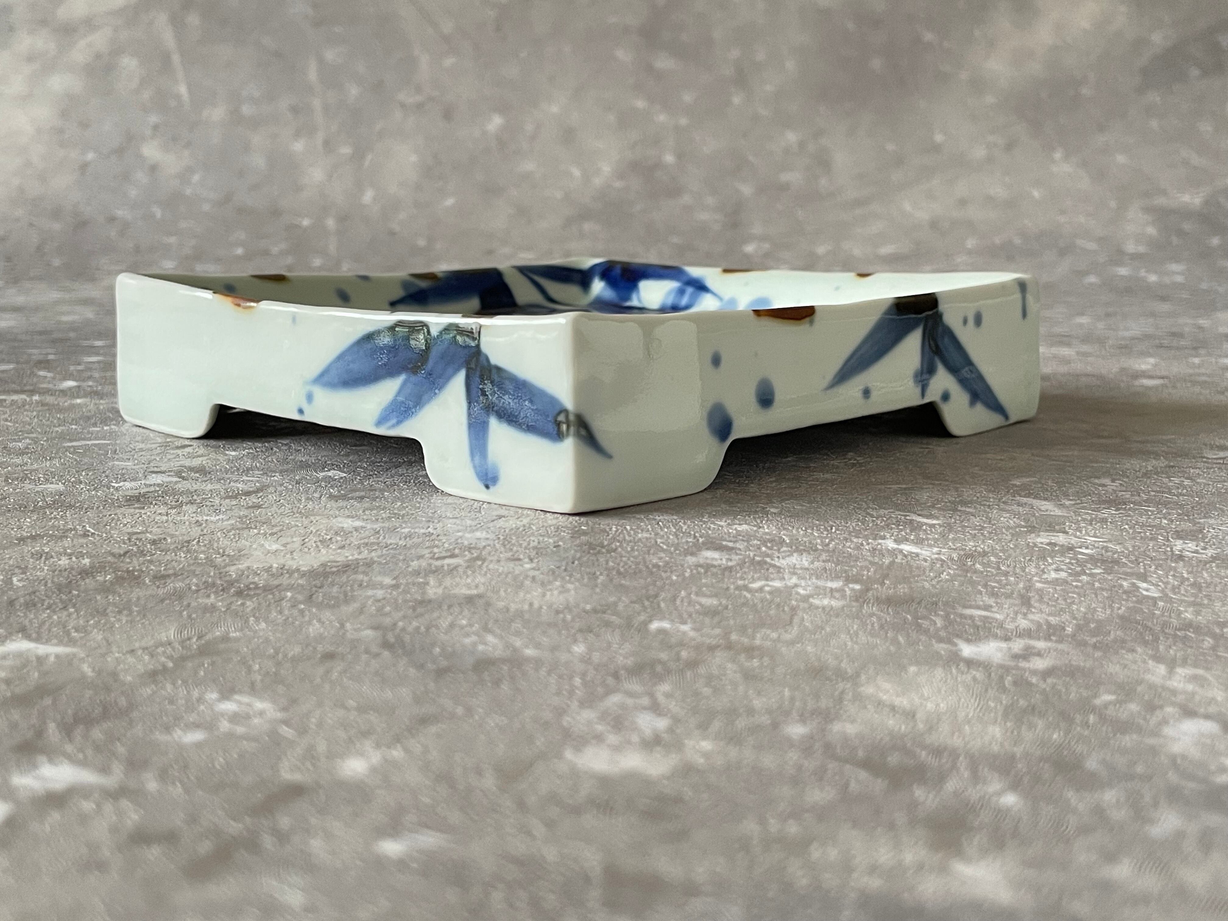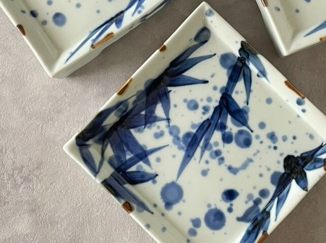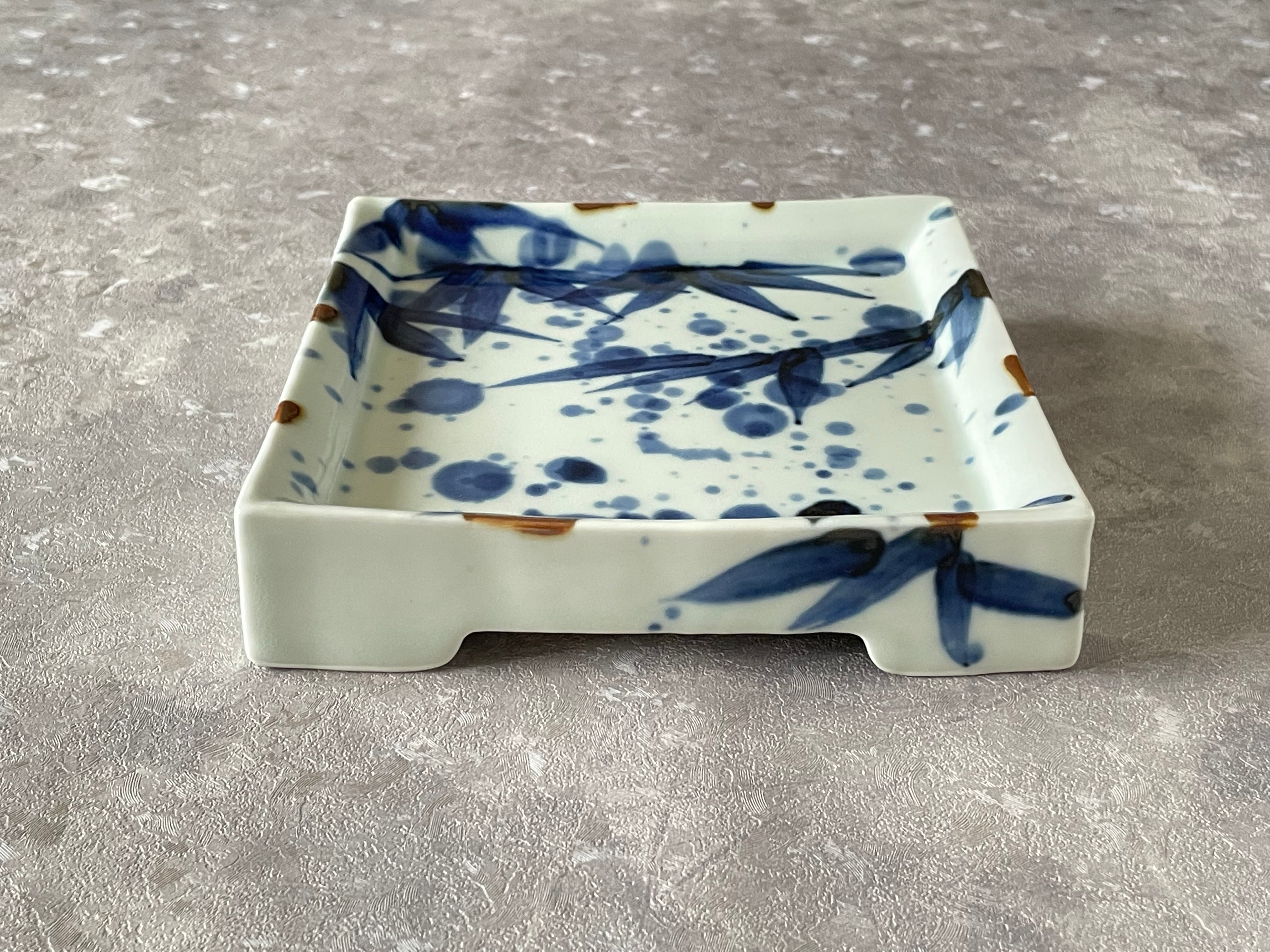 有田焼 福泉窯 高台四ッ足正角皿 15cm / 染付吹き墨笹絵