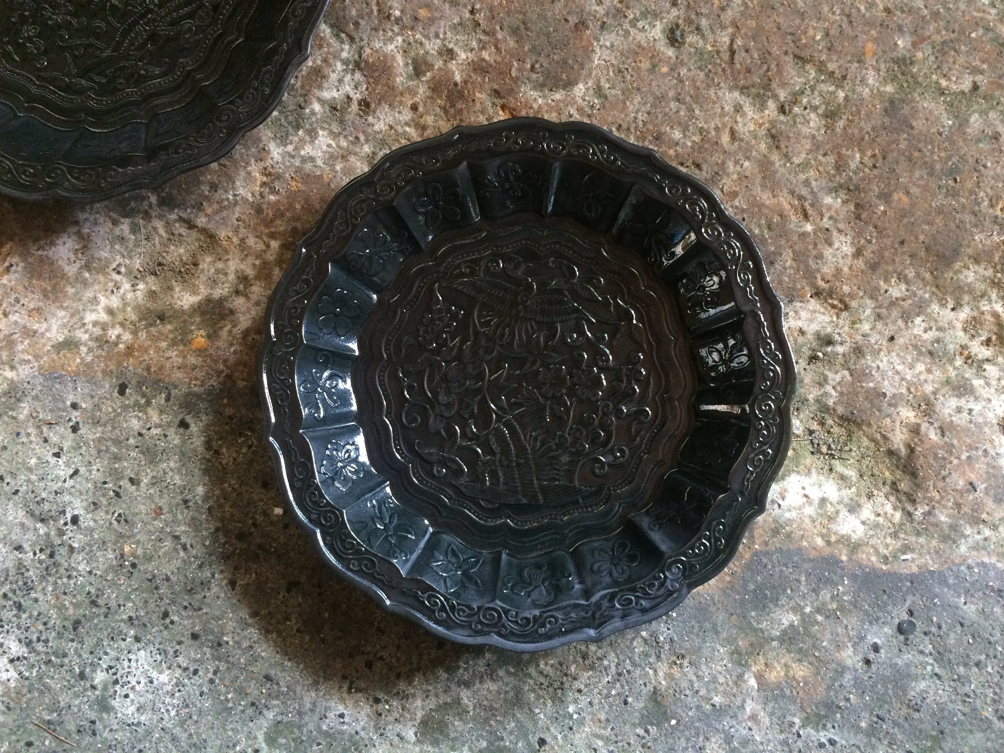 有田焼 間取り花蝶 / 鳳凰彫り5寸皿 取り皿 (黒釉)